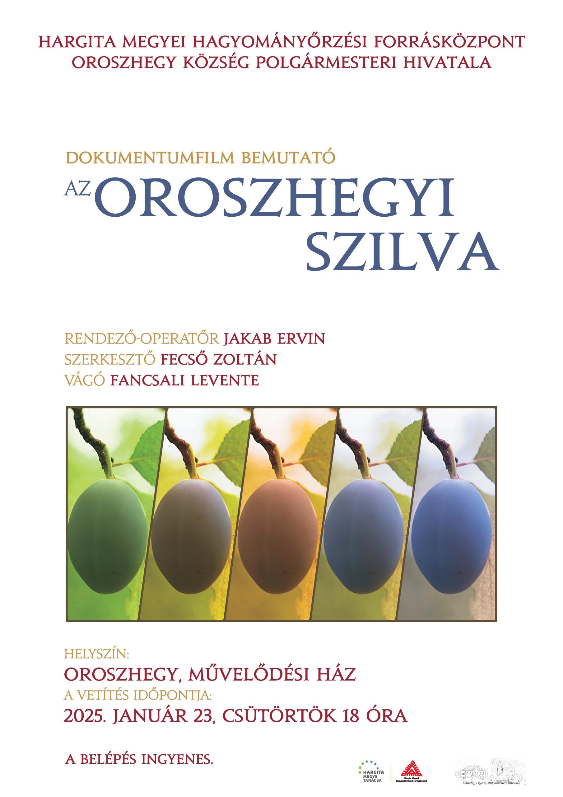 Dokumentumfilm bemutatót szervez a Hargita Megyei Hagyományőrzési Forrásközpont Oroszhegyen 2025. január 23-án, csütörtökön 18 órától a művelődési házban Oroszhegy község Polgármesteri Hivatalával partnerségben. Az oroszhegyi szilva című film rendező-operatőre Jakab Ervin, szerkesztője Fecső Zoltán, vágója Fancsali Levente. A belépés ingyenes. A film az elmúlt esztendőben készült a Hargita Megyei Hagyományőrzési Forrásközpont megrendelésére, Hargita Megye Tanácsa anyagi támogatásával, témája az Oroszhegy hírnevét megalapozó szilva, annak termesztése, hasznosítása a múltban és napjainkban.