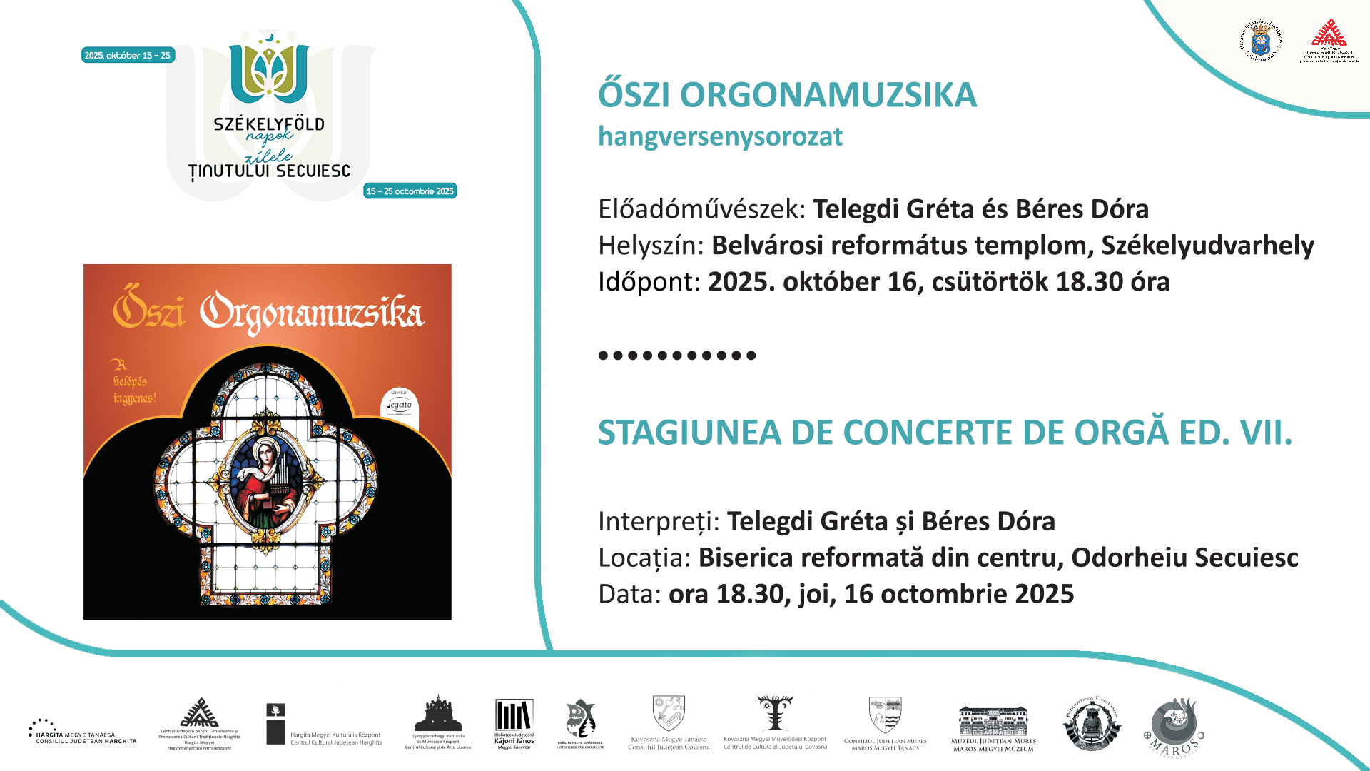 Telegdi Gréta és Béres Dóra hangversenyén az orgona és trombita különleges, zenés párbeszéde csendül fel 2025. okt. 16-án a Székelyudvarhely Belvárosi Református Templomban 18.30-tól. Az Őszi orgonamuzsika sorozat keretében szervezett koncertre a belépés ingyenes. Szervező: Legato Egyesület. Támogatók: Hargita Megyei Hagyományőrzési Forrásközpont, Székelyudvarhely Városa.