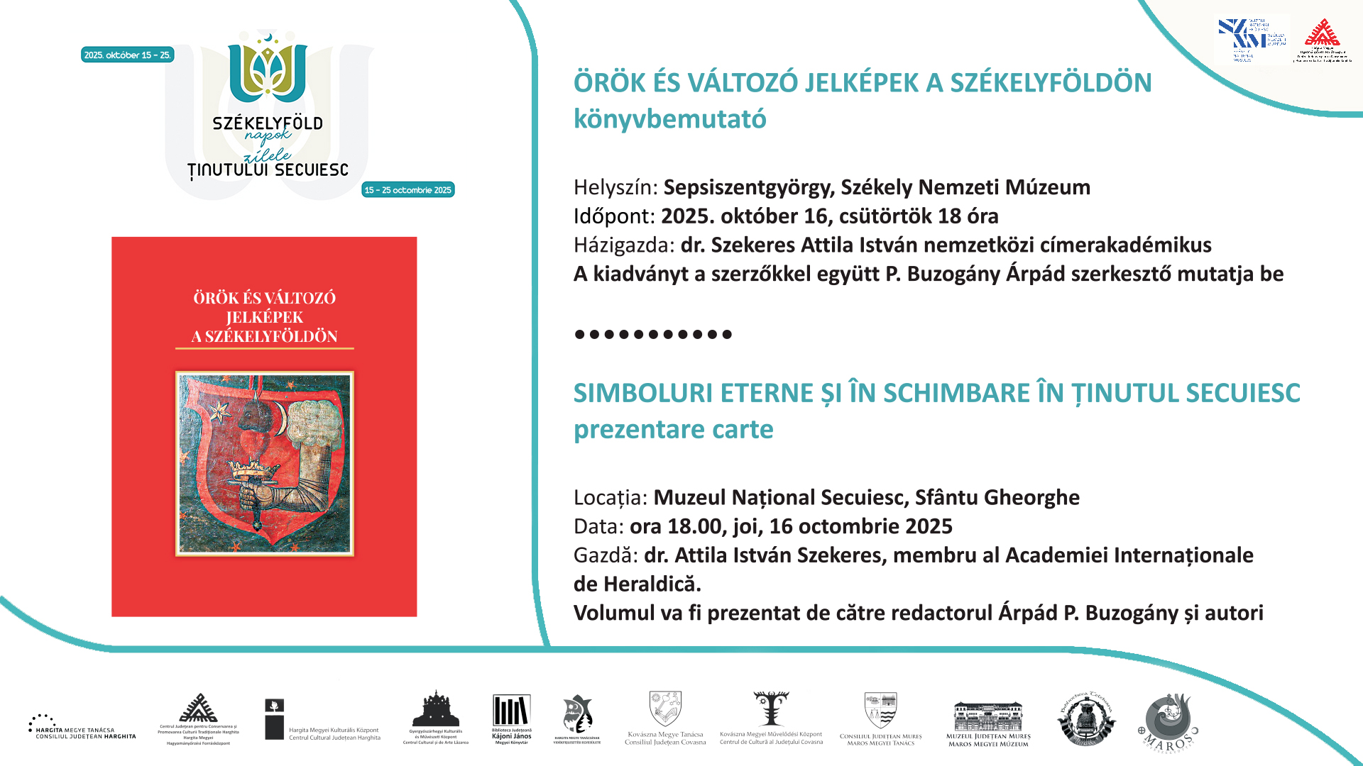 În orașul Sfântu Gheorghe, la sediul Muzeul Național Secuiesc va avea loc în data de 16 octombrie, joi, orele 18 prezentarea unui volum de studii despre simbolurile secuiești, editată de Centrul Judeţean Pentru Conservarea şi Promovarea Culturii Tradiţionale Harghita. Cartea cu titlul Simboluri eterne și în schimbare în Ținutul Secuiesc are ca autori istorici contemporani: dr. Zoltán Bicsok, arhivist din Miercurea Ciuc, János Mihály, istoric din Lueta, dr. Sándor Pál-Antal, arhivist din Târgu Mureș și dr. Attila István Szekeres, istoric din Sfântu Gheorghe, membru al Academiei Internaționale de Heraldică. Volumul recent apărut va fi prezentat de către editorul Árpád P. Buzogány împreună cu autorii care vor fi prezenți la aceast eveniment. Gazda programului va fi d-l dr. Attila István Szekeres.