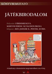 A csíkbánkfalvi Márton Ferenc Általános Iskolában 2025. január 31-én, pénteken 10 órától kortárs gyermekverskötet bemutatására kerül sor. A Játékbirodalom című kiadvány Hargita megyei szerzők: Botár Emőke, Főcze Kornélia, Nagyálmos Ildikó és P. Buzogány Árpád gyermekverseit tartalmazza és a Hargita Megyei Hagyományőrzési Forrásközpont jelentette meg. A könyvet a székelyudvarhelyi Dr. Palló Imre Művészeti Szakközépiskola tanulói illusztrálták. Terjedelme 64 oldal, teljesen színes, kemény kartonborítóval (21X21 cm) készült, a helyszínen megvásárolható (ára 43 lej).